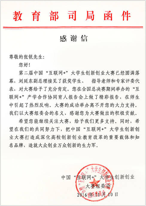 2018年,爱体育连续多年为中国国际互联网+大学生创新创业大赛做出积极贡献,获教育部来函致谢。